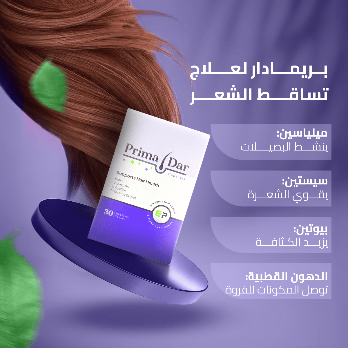 تقييم طبي: تركيبة بريمادار الغنية بالبيوتين والمعادن الأساسية أثبتت كفاءة عالية في دعم حالات تساقط الشعر الناتجة عن نقص المغذيات.